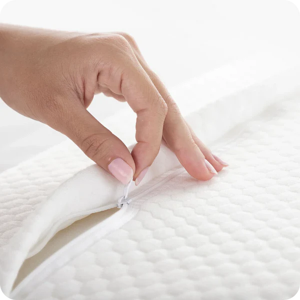 Il cuscino è realizzato in memory foam ad alta densità e rivestito con una fodera traspirante e lavabile, che mantiene la temperatura ideale durante tutta la notte.